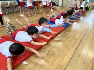 先生のお話をよく聞いて、鬼ごっこをしたりマット運動をしたりと楽しく活動することができましたね。