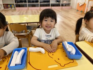 粘土の使い方を聞いて、感触を楽しんだりや粘土を細く伸ばす、丸くする、薄く伸ばすなど自由に遊んでみました。
