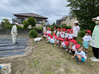 園長先生の畑に着き、植え方の説明を聞きました。