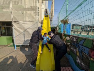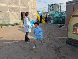 非常ベルがなり、園長先生の放送を聞き、担任の先生の指示に従って避難を開始しました。