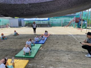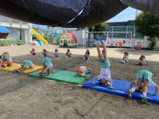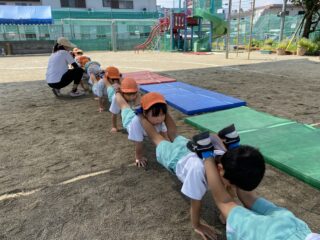 天気が曇りで涼しい日があったので初めて外で組体操の練習をしました!