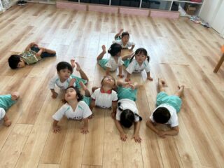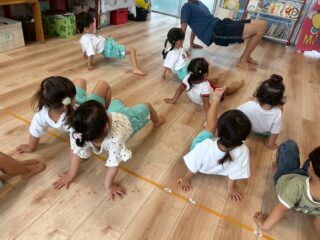 柔軟運動では、腹ばいになって胸をぐーんとそらしたり、おなかを上にして四つん這いになったり…