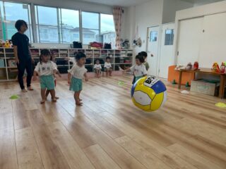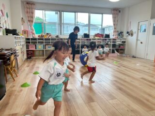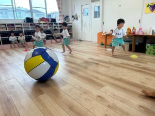 そのあとは、大きなボールに当たらないように逃げる練習。ボールが近づくと