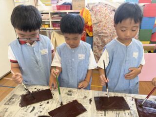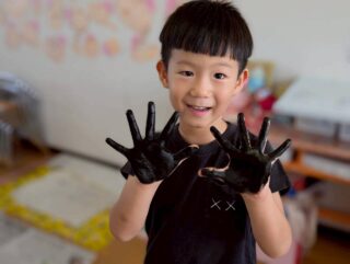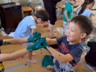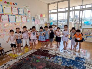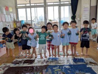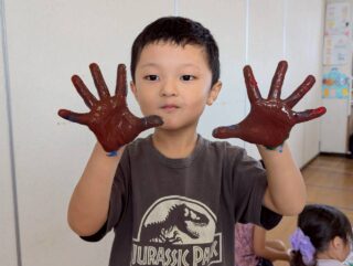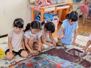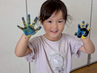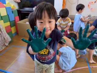 「きもちいいー!」と絵の具の感触を楽しんだり、「赤と青混ぜたらどうなるかな?」と色の変化を楽しんだり、お友だちと手をくっつけて楽しむ姿など・・・みんなキラキラな笑顔でとっても楽しそうに活動していました♡