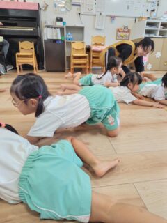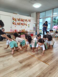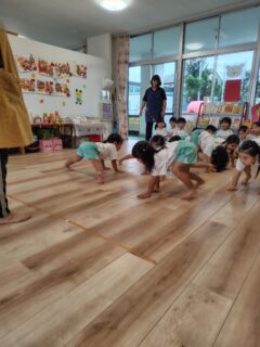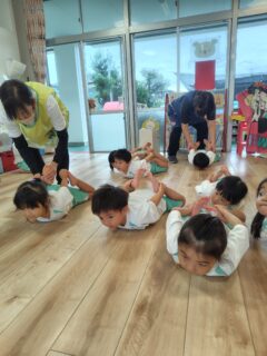 うさぎやアヒル、ワニさんにカメさん。ギャロップなど足の指やおなかの筋肉を使って楽しみました。