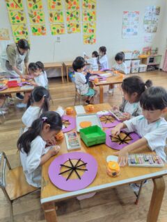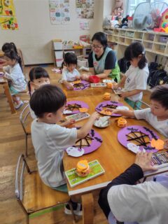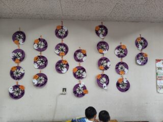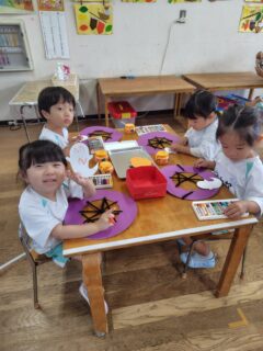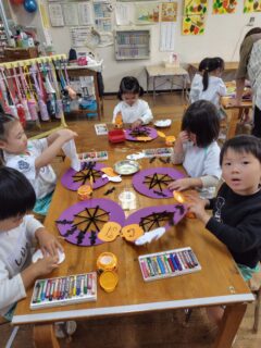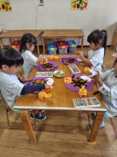 初めての毛糸通しにチャレンジしてクモの巣を作ったりおばけやかぼちゃに顔を描いてリースに貼ったりしました。