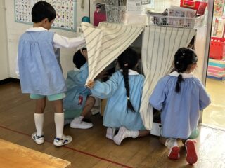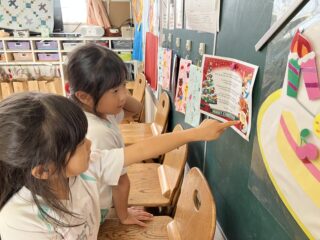 「あれって、先生が作ったの?」「サンタさんからじゃない?」「なんか中に入っているみたいだよ!」