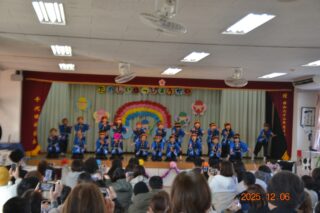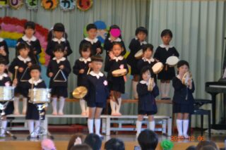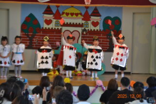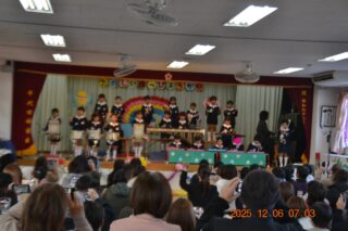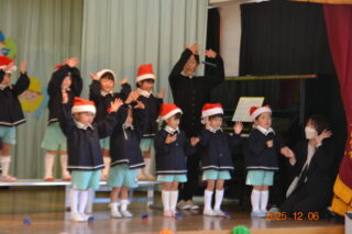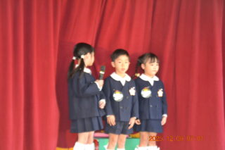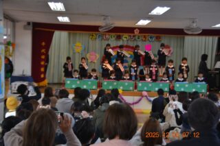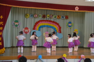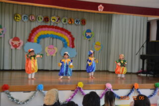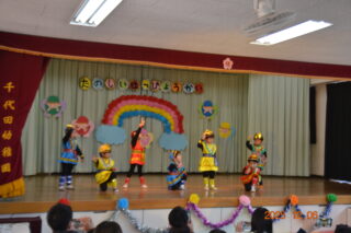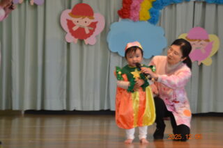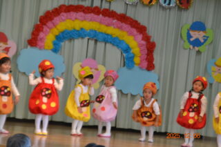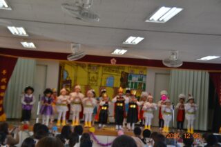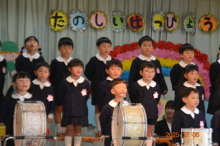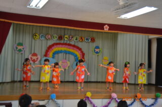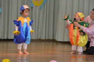 年長組は歌、合奏、ピアニカ奏、遊戯、セリフ劇を、年中組は歌、合奏、舞踊劇を