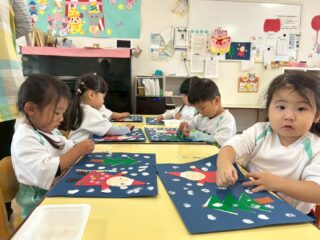 ツリーの製作では、四角い折り紙を三角に折ると「できた!」と嬉しそうな表情をし、