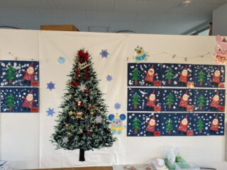 折れたツリーに好きなシールをぺたぺたと貼り、素敵なクリスマスツリーに仕上げていました。