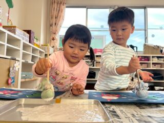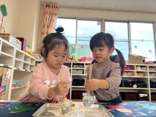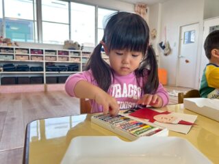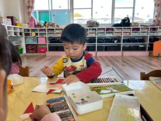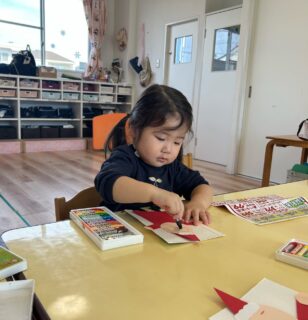 ツリーの製作では、四角い折り紙を三角に折ると「できた!」と嬉しそうな表情をし、