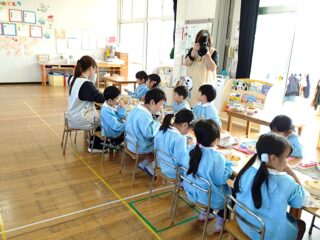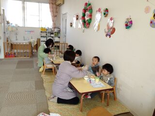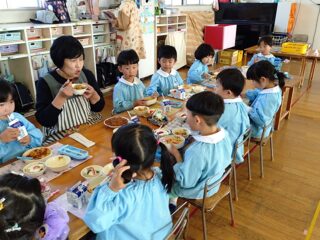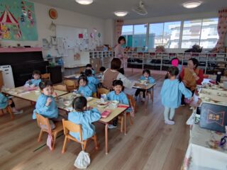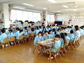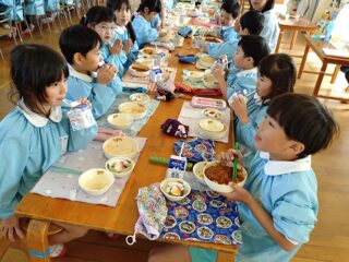 年長と年中は2階のホールで、小さい組は各クラスで食べました。