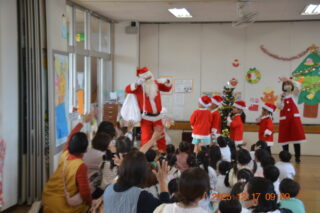 司会の先生がクリスマスのお話をしていると、クリスマスソングとともに、ちびっこサンタが登場!