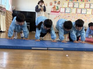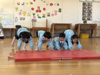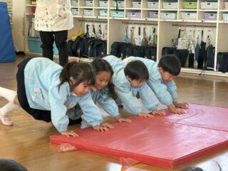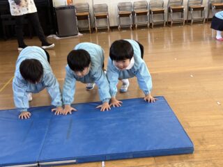 雑巾がけの前に、みんなで力を合わせてマット押しに挑戦しました!