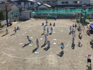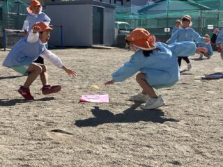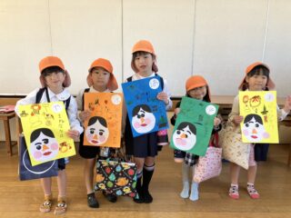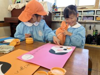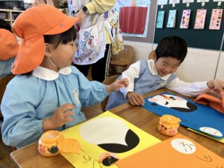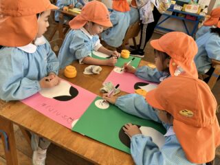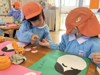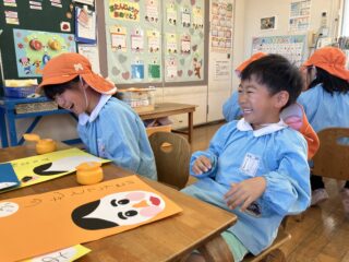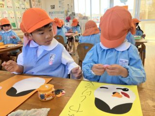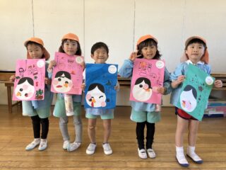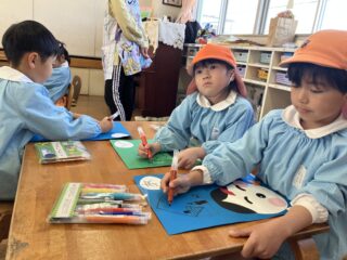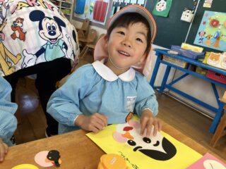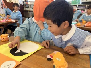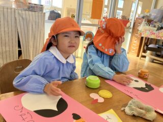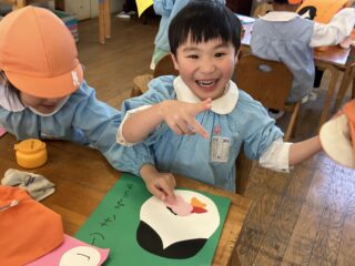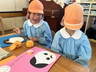 2人ペアになって、福笑いにチャレンジ!先生が指定した顔の部位に糊をつけて、お友達に渡してあげました。