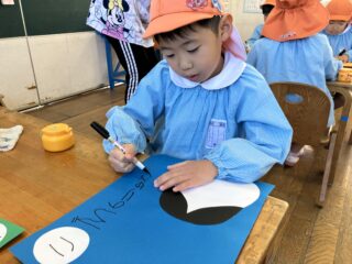 みんなの福笑いが完成したら、お正月にちなんだ物を描いていきました。
