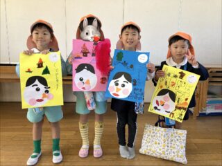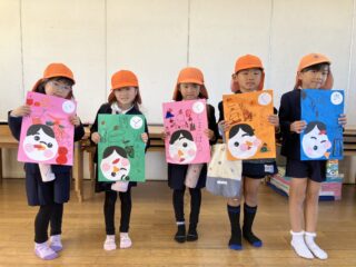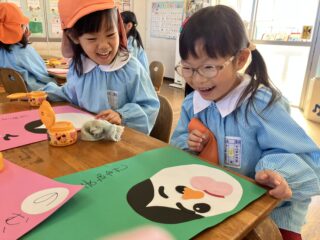 3学期がスタートしました。今日はお正月遊びとして、福笑いカルタを作って遊びました♪