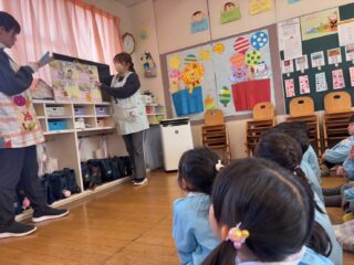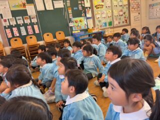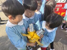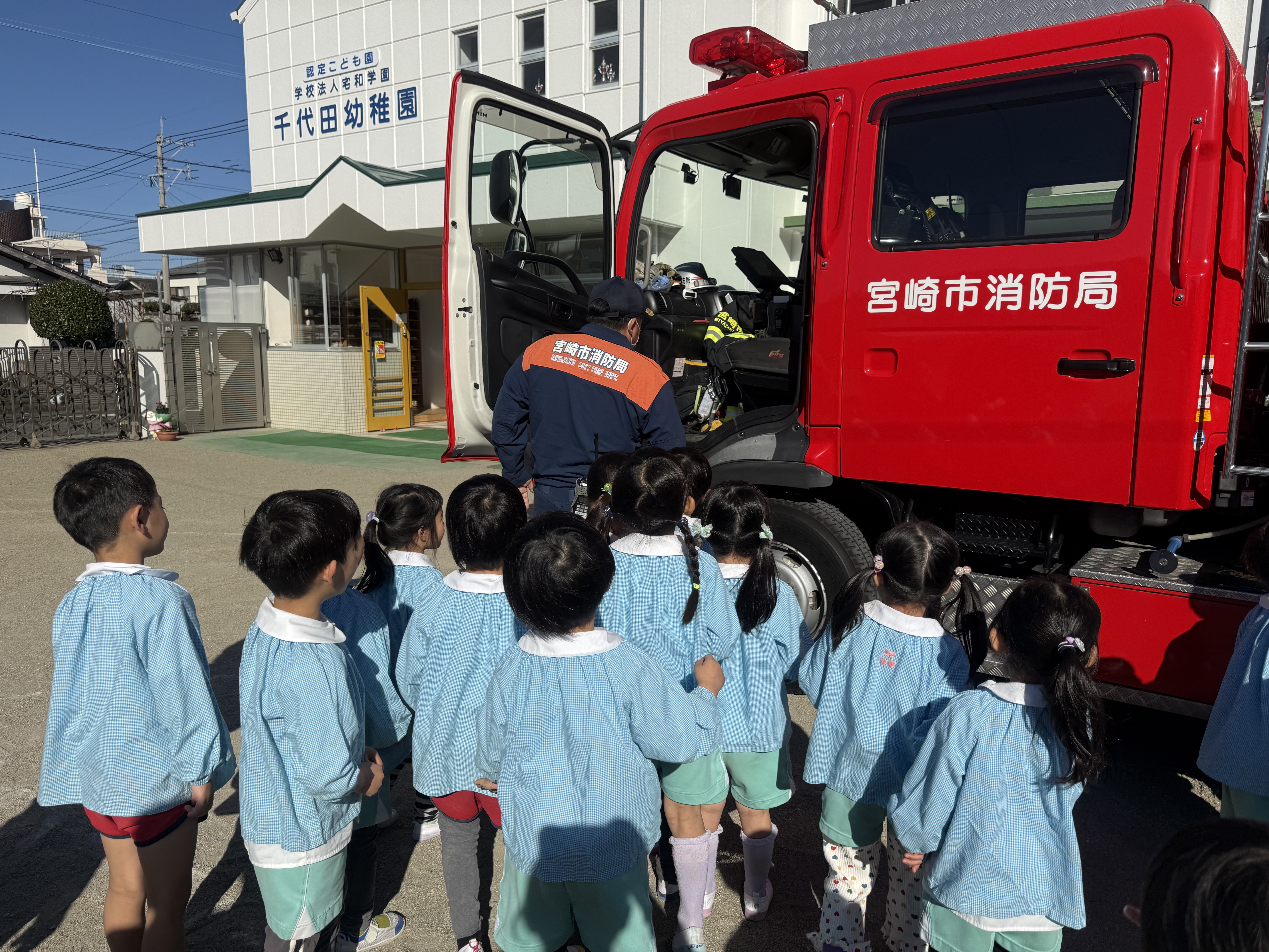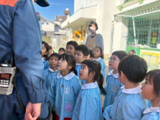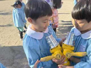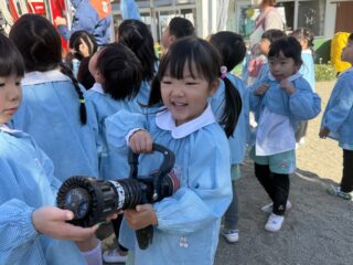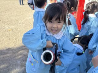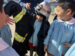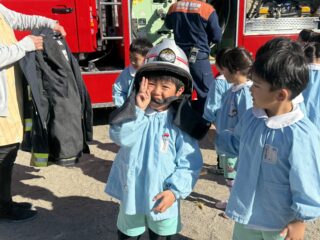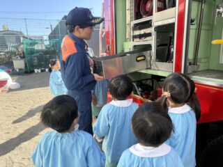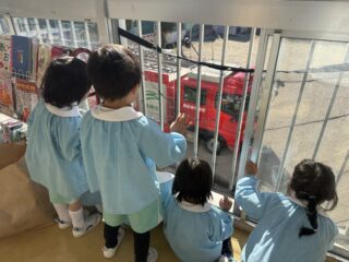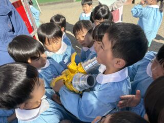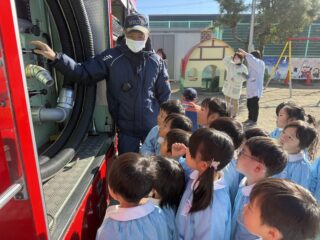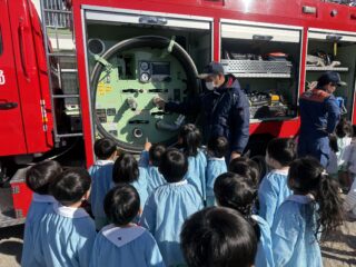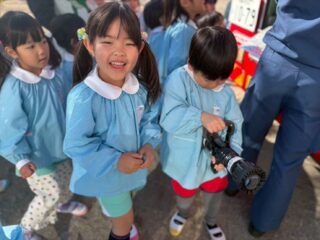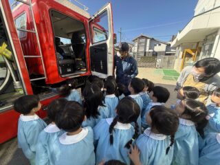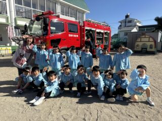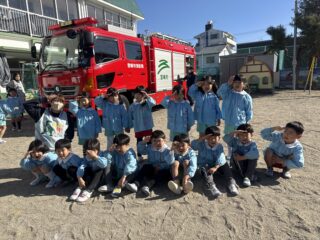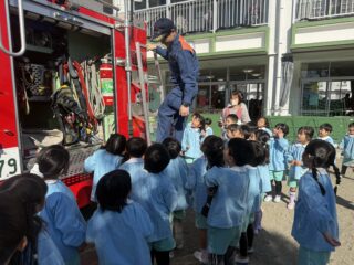 今日は火災の避難訓練があり、南署の消防士さんと消防車が幼稚園に来てくれました🚒