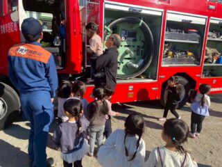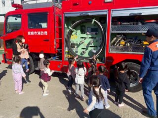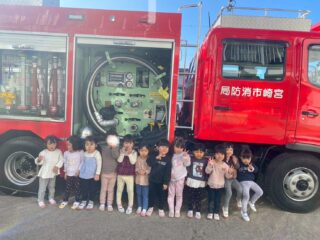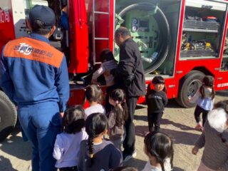 1月14日(水)避難訓練があり、幼稚園に消防車が来ました。赤い大きな消防車を見て、子どもたちは「わあ!」とびっくり。消防士さんにごあいさつをして、消防車を近くで見せてもらいました。少しドキドキしながらも、じっと見つめたり、指をさしたりする姿が見られました。みんなで「火はこわいね」「お話を聞いて逃げようね」とお話しし、楽しく大切な時間を過ごしました。