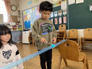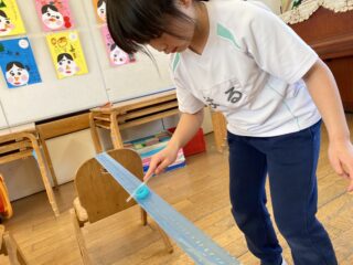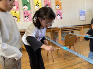 スズランテープの上を落とさないように慎重に動かす子や、コツを掴んで勢いよく動かせる子など