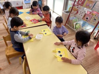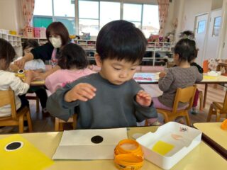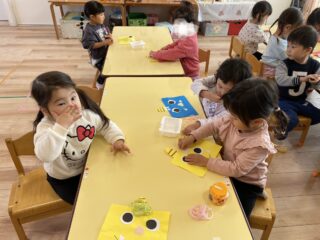 鬼の顔の色や角の本数を、自分で決めて、楽しそうに作る子どもたち。