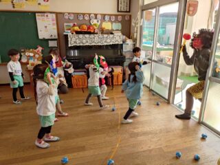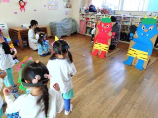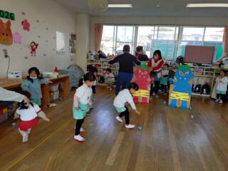 グループごとに赤鬼青鬼に向かって豆まきを楽しみました。