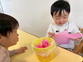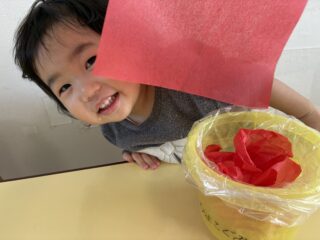 1人ずつ好きな色のお花紙を選んでから作り始めました。