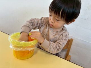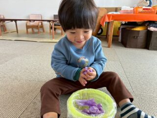 途中からは鬼さんの口にボールを入れご飯を食べさせていました😆