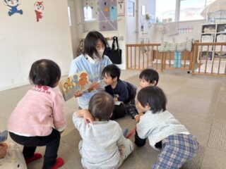 絵本を見てから、豆まきごっこをしました。