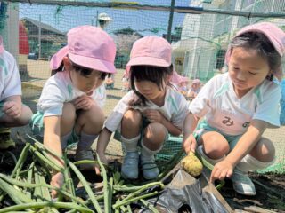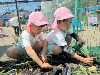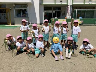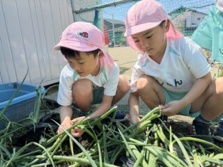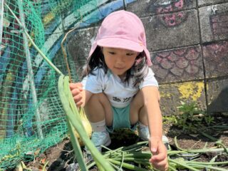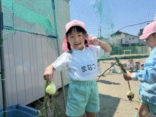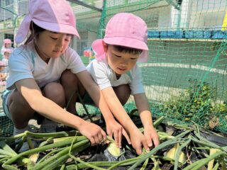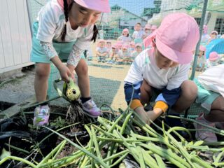 園で植えていた玉ねぎが大きくなり、ぞうぐみさんが代表で収穫のお手伝いをしました!