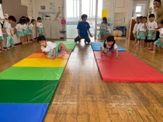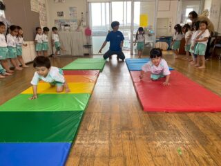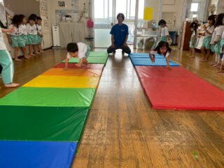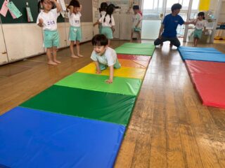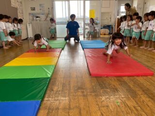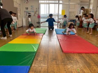 お尻での鬼ごっこや、マットの上でライオンやペンギンになりきる動き、