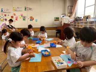 翌日は、色紙をハサミでさまざまな形に切り、こいのぼり作りに挑戦しました。