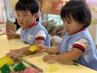 食紅で色をつけた寒天を潰したり、混ぜたり、カップに入れたり…