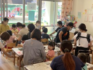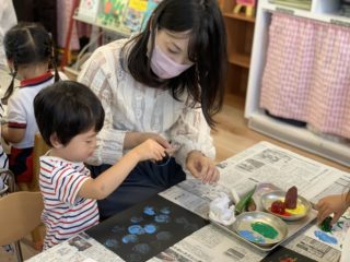 朝の会をし、野菜とフルーツのいないいないばあ!のペープサートをした後、親子で野菜スタンプをしました。